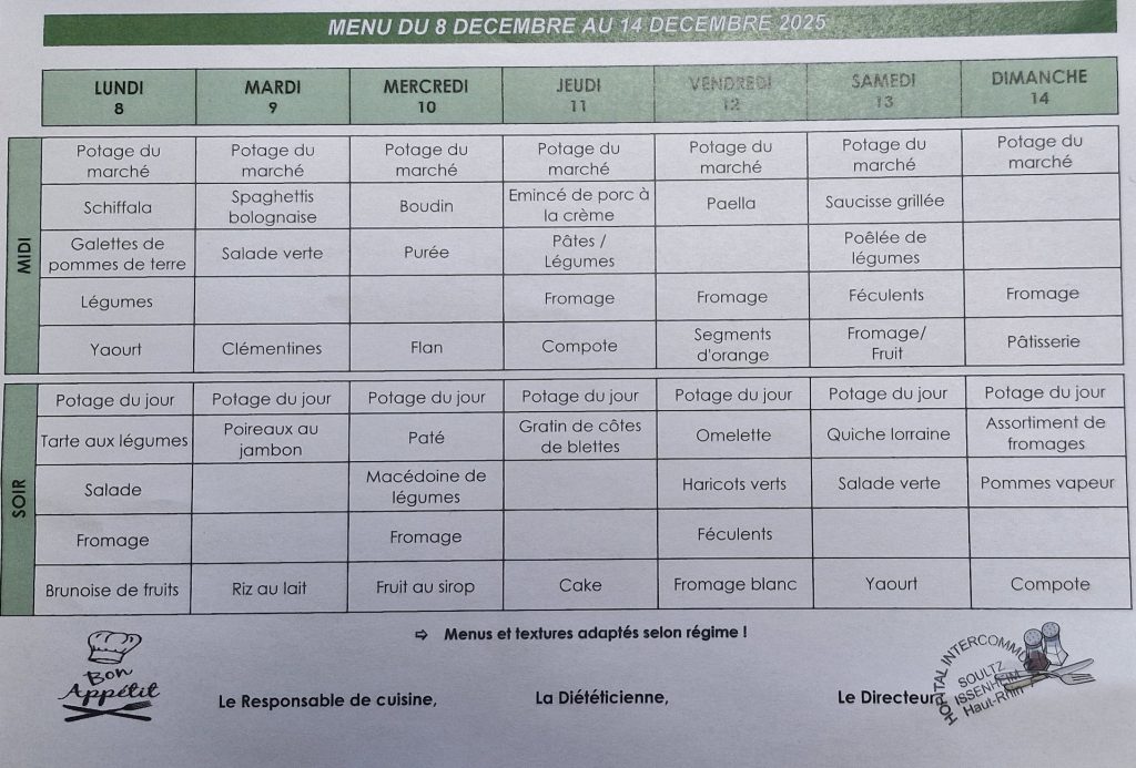 Ce menu tient compte des fêtes calendaires et des souhaits des patients/résidents et du personnel qui déjeune sur place.